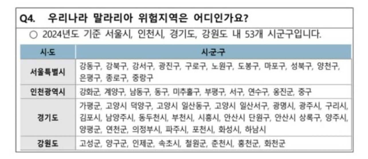 국내 말라리아 환자는 현재 경기> 인천> 서울