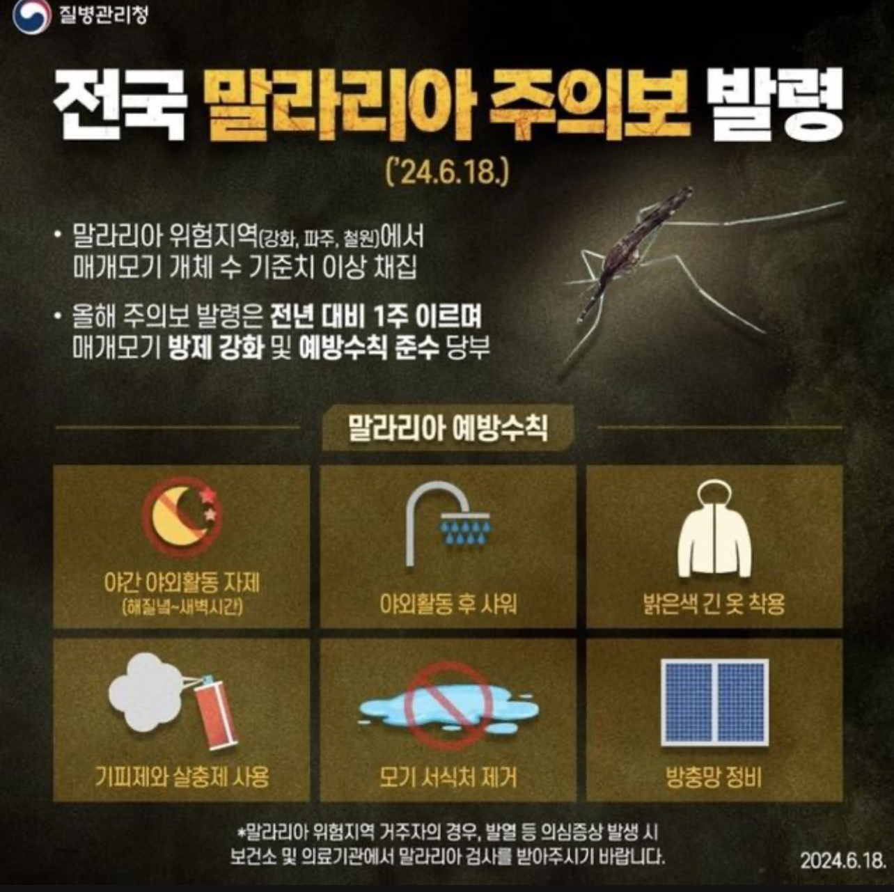 질병 관리청이 6월 18일자로 전국에 말라리아 주의보를 발령했습니다.