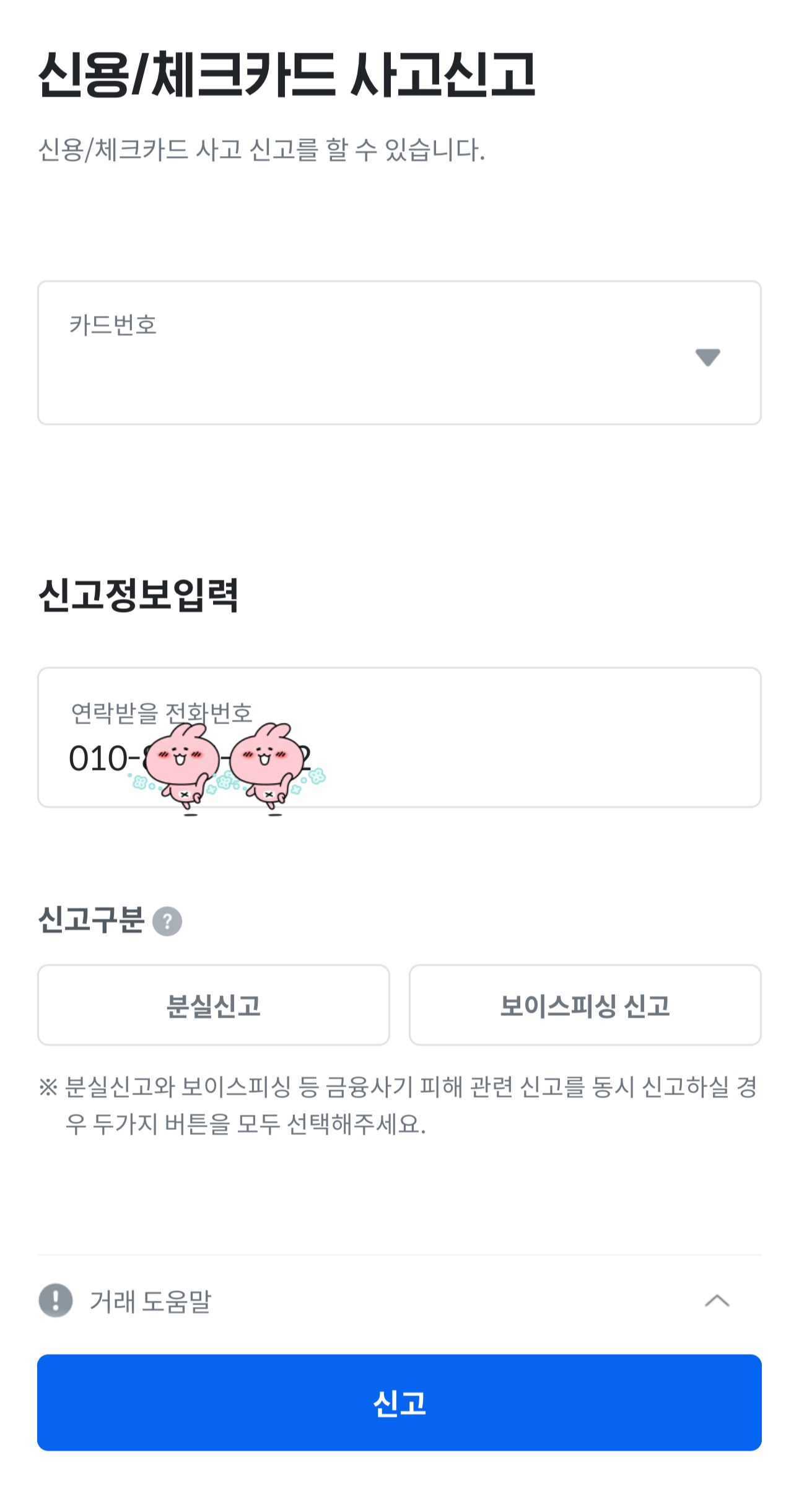 사고신고 메뉴에서 신용/체크카드를 눌러서 사고신고를 먼저 해주셔야 해요!