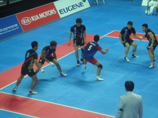 카바디는 두 팀 간에 진행되는 게임으로, 각 팀은 7명의 선수로 구성됩니다. 게임은 두 팀이 각각 자신들의 영역에서 상태방 영역으로 침투하려고 시도하는 방식으로 진행됩니다.